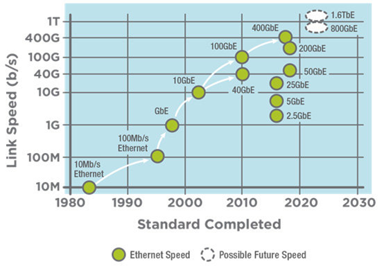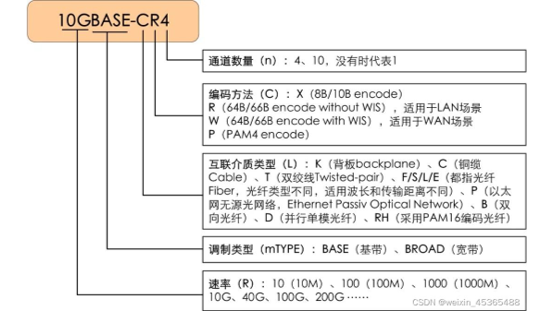 因为交换机是即插即用的,链路层彼此隔离,所以主机和交换机可以用不同的链路连接,每个链路支持的物理介质(光纤, 同轴电缆, 双绞线, 电气背板)也可以不同,速率(1G, 10G, 100G)也可以不同。以太网定义了一些物理层标准: